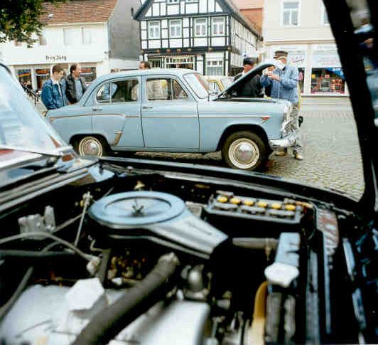Ein Moskwitsch 403 (Baujahr 1964) in der hierzulande fast unbekannten Standardausführung. Im Vordergrund der Motorraum eines Moskwitsch 412.